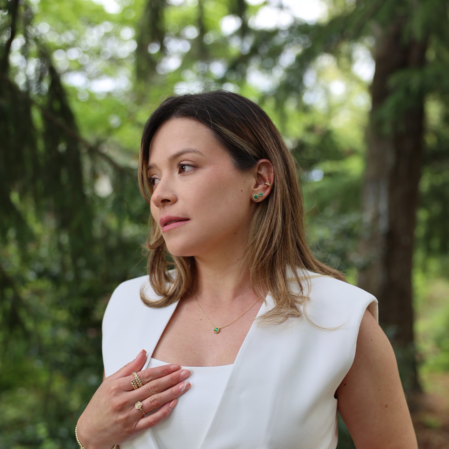 At the heart of the design lies a radiant round Emerald, its brilliance mirroring the pursuit of harmony in our lives. A triumphant embodiment of balance, this harmony braid necklace reflects the interplay of three essential elements: the Mind, a wellspring of intellect; the Body, a vessel of strength; and the Soul, the very essence of who we are. When these elements align and thrive, they compose the symphony of a harmonious life. These earrings will be the reminder to find the path to get it, a radiant beacon guiding us towards a life in perfect equilibrium.